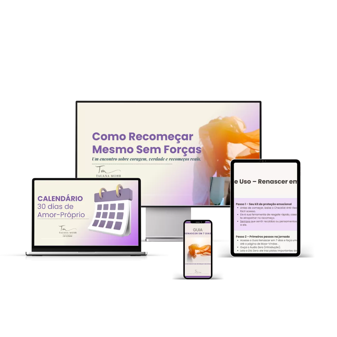 O Renascer em 7 Dias é um guia emocional e acolhedor, criado especialmente para mulheres que querem recomeçar mesmo sem forças, mesmo no fundo do poço.